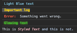console.log('%c Error: ', 'color: #FF6347; font-weight: bold;', 'Something went wrong.');